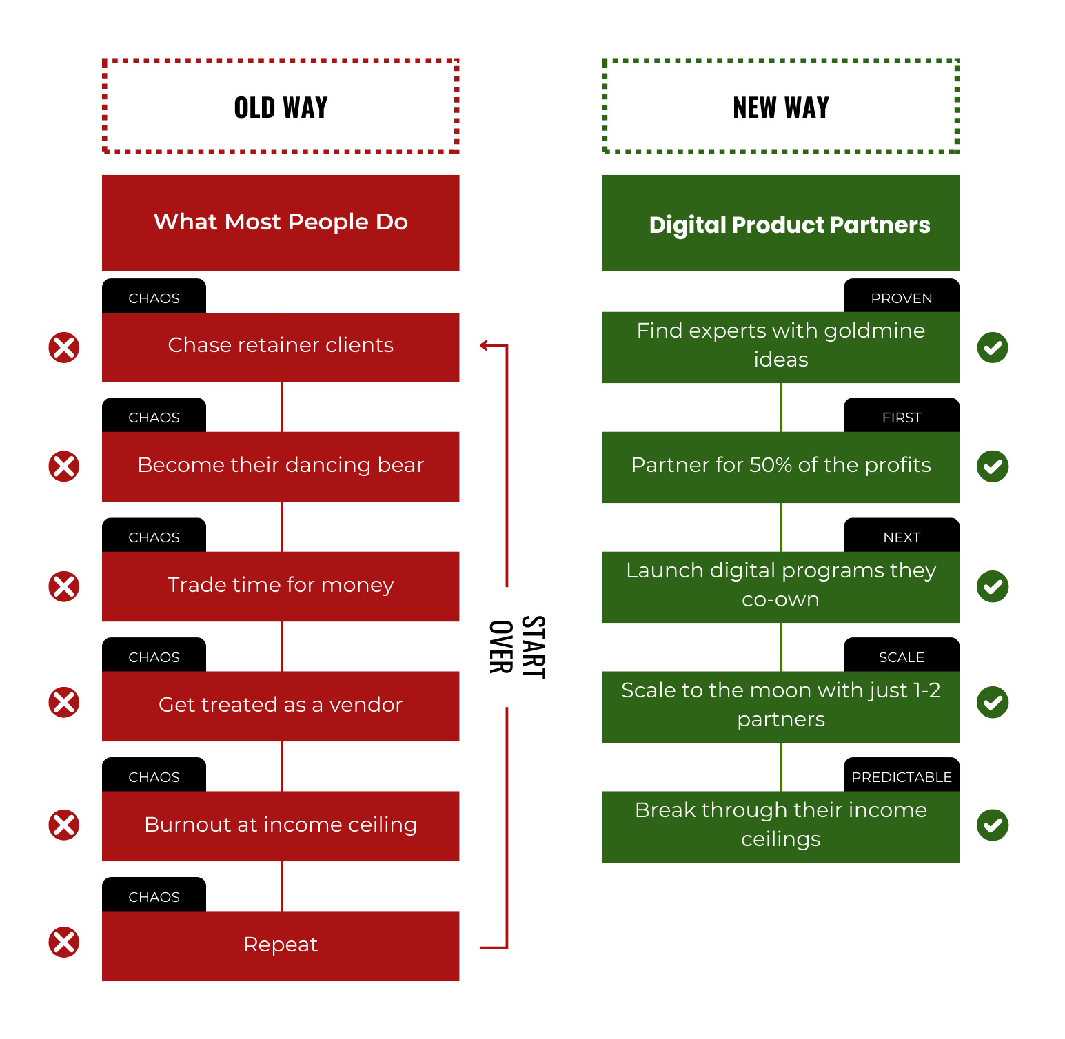 ✓ Stop chasing retainers—own 50% of profitable digital product businesses