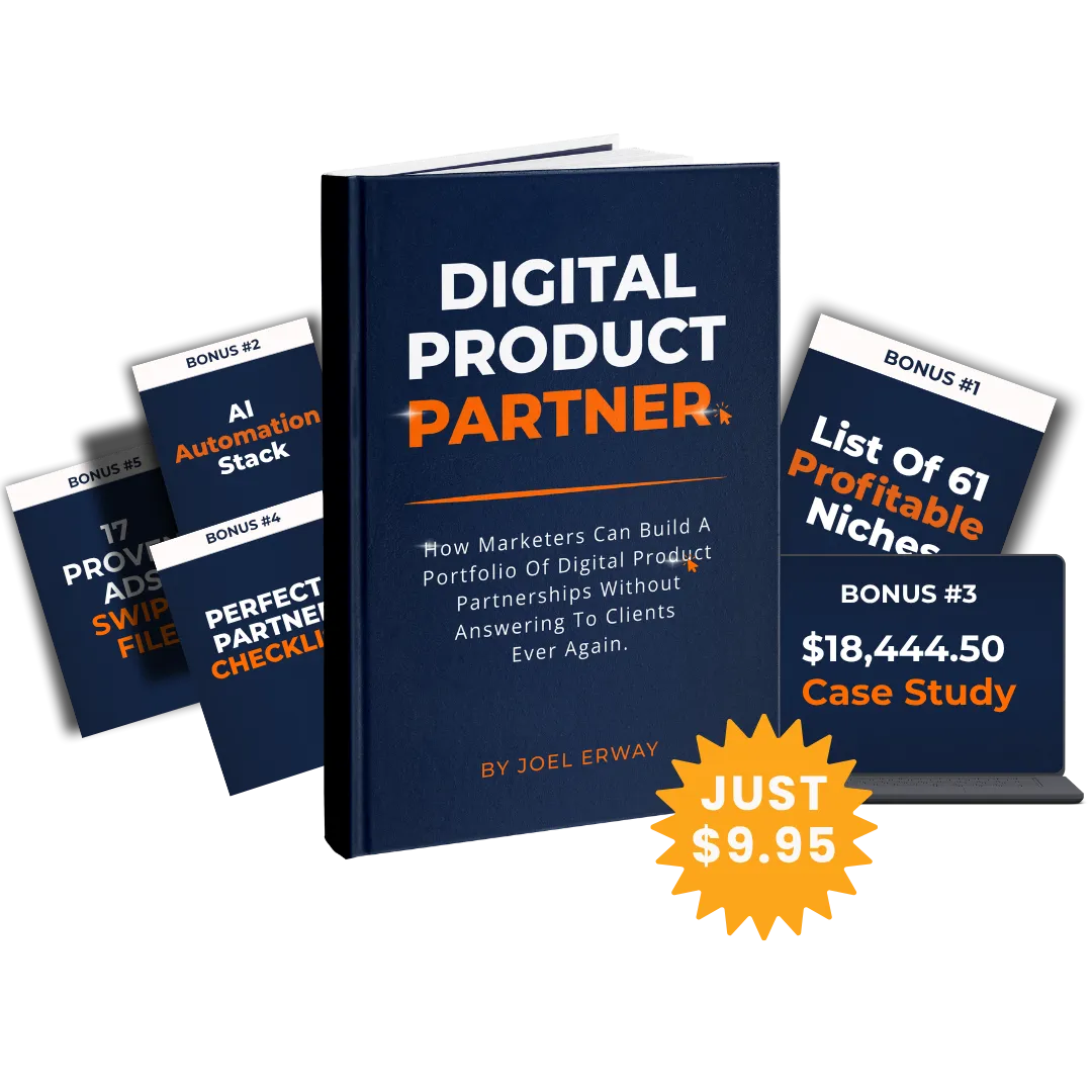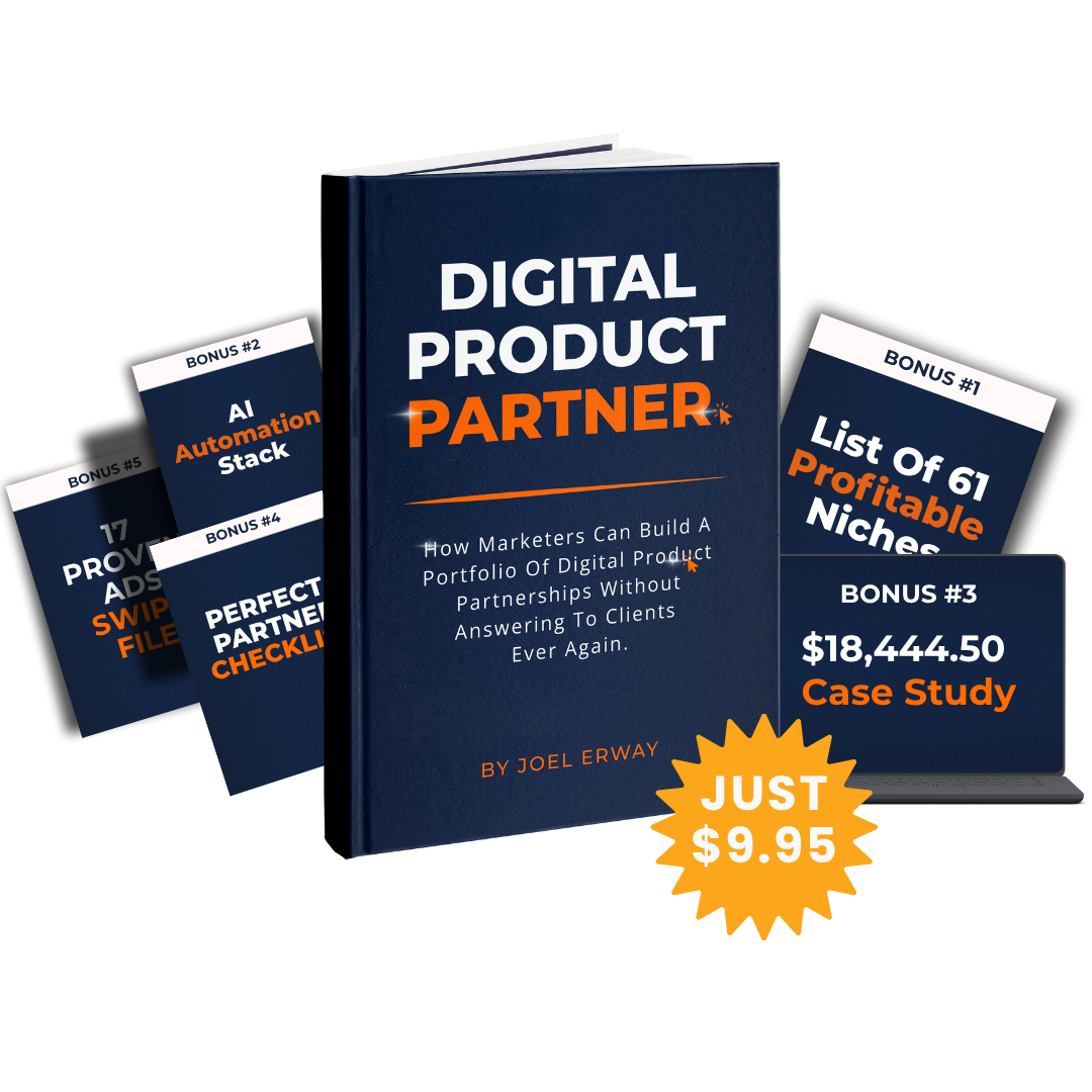 You're securing your copy of the Digital Product Partner book. NOW AVAILABLE FOR INSTANT DIGITAL DOWNLOAD. You're also getting the 61 Profitable Niches List, My Personal AI Automation Stack, The $18K Partnership Case Study, The Perfect Partner Checklist, and The 17 Proven Ads Swipe File.